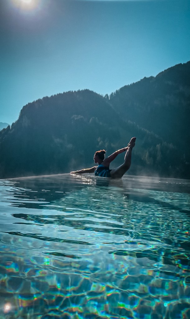 Acqua Yoga ogni Sabato ore 7:45 – 8:30 Infinity Pool riscaldata Charme Hotel Uhrerhof Dëur Fraz. Bulla Ortisei (dal 05/07/2025 al 20/09/2025)